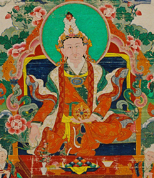 位居左侧的是法王赤松德赞,他面色严肃,剑眉微蹙,头戴白色缠头高冠,身着橙衣红氅,绿色的飘带规整、服帖的垂于身侧,显示出他严谨、坚毅的性格。赤松德赞双手当心,结说法印,右手执红色乌巴拉花,花蕊中有一把宝剑。左手执红色莲花,上面有般若经函(文殊菩萨标志),双足半跏趺坐于宝座上。