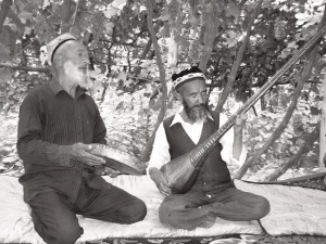 维吾尔族老艺人(右)在弹奏弹拨尔