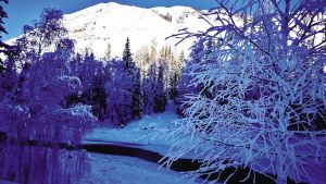 源出喀纳斯湖的布尔津河是额尔齐斯河的支流,在喀纳斯这段被称作喀纳斯河。冬天喀纳斯湖封冻,而南端河湖交界处却有湖水缓缓流入喀纳斯河。大桥以下河段,大石密布,水流稍急,激起浪花;两岸一边是高高的桦树、松树挂满白雪,一边是河里、岸边的大石形成一个个雪蘑菇,夕阳照射下河中雪山倒影与水面上升起的雾气共同构建一种梦幻之境。