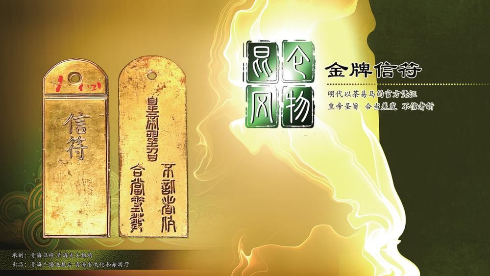 明代以茶易马的官方凭证金牌信符,上有篆书铭文“皇帝圣旨,合当差发,不信者斩”。